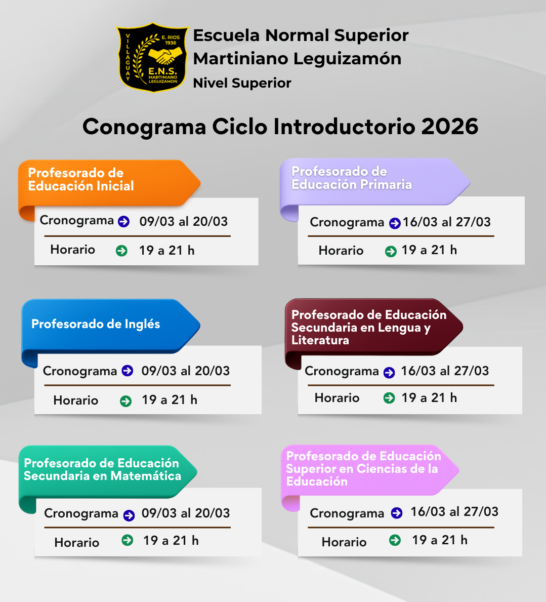 El Nivel Superior de la Escuela Normal Superior “Martiniano Leguizamón” comunica que el inicio del Ciclo Introductorio para los estudiantes ingresantes a los primeros años de las carreras de Formación Docente Inicial, se desarrollará a partir del día lunes 09 de marzo hasta el día viernes 27 de marzo a partir de las 19 hs. Asistir según la agenda correspondiente a cada profesorado.