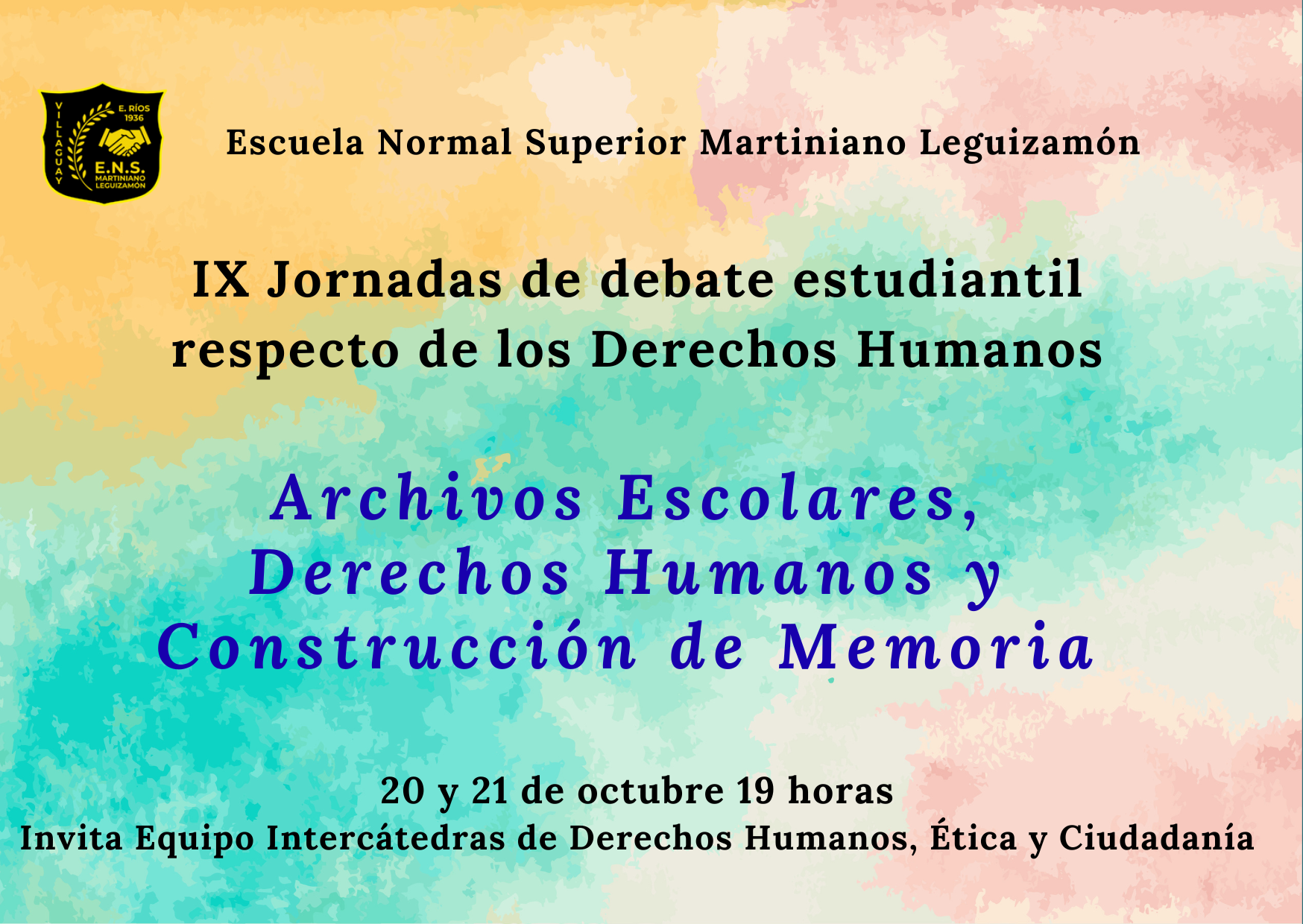 El Equipo Intercátedras de Derechos Humanos, Ética y Ciudadanía del Nivel Superior de la Escuela Normal Superior Martiniano Leguizamón invita a las IX Jornadas de Debate Estudiantil respecto de los Derechos Humanos: Archivos Escolares, Derechos Humanos y Construcción de Memoria. Las mismas tendrán lugar los días 20 y 21 de octubre a partir de las 19 horas.