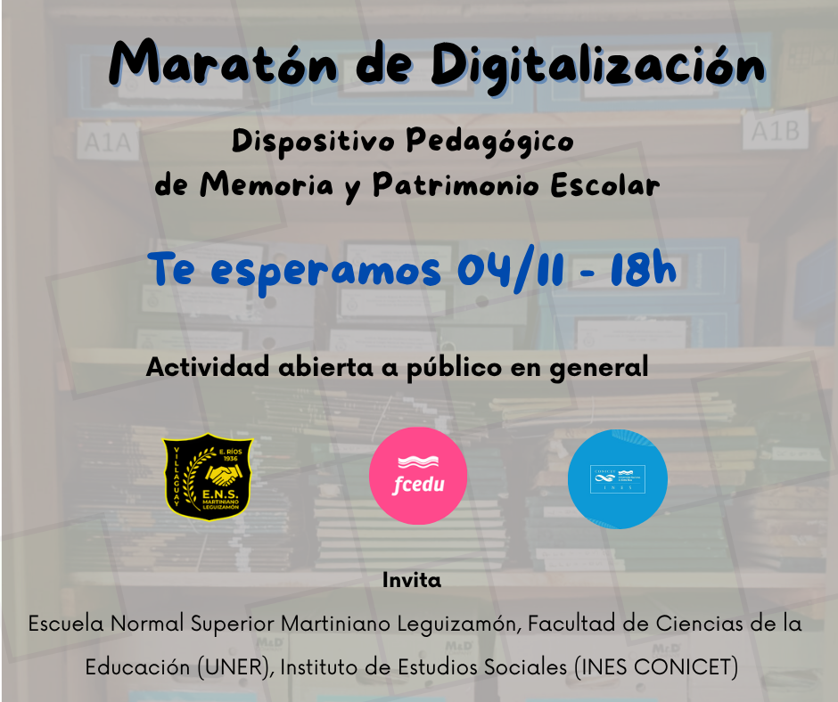El Equipo del Dispositivo Pedagógico de Memoria y Patrimonio Escolar de la Escuela Normal Superior Martiniano Leguizamón, invita a la comunidad a la Maratón de Digitalización del Fondo Documental Institucional, actividad propuesta en articulación con la Facultad de Ciencias de la Educación de la Universidad Nacional de Entre Ríos y el Instituto de Estudios Sociales (INES – CONICET).