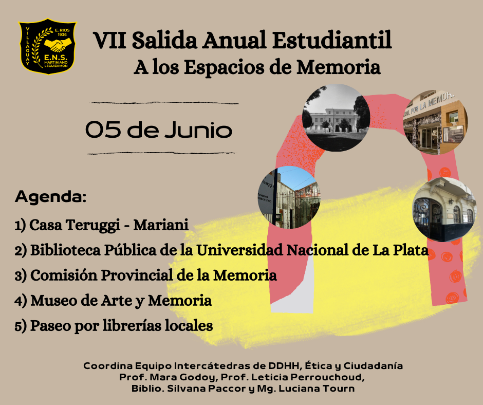 El Equipo Intercátedras de Derechos Humanos, Ética y Ciudadanía del Nivel Superior, invita a participar de la VII Salida Anual Estudiantil a los Espacios de Memoria, propuesta para el día viernes 05 de Junio en la ciudad de La Plata, provincia de Buenos Aires.
