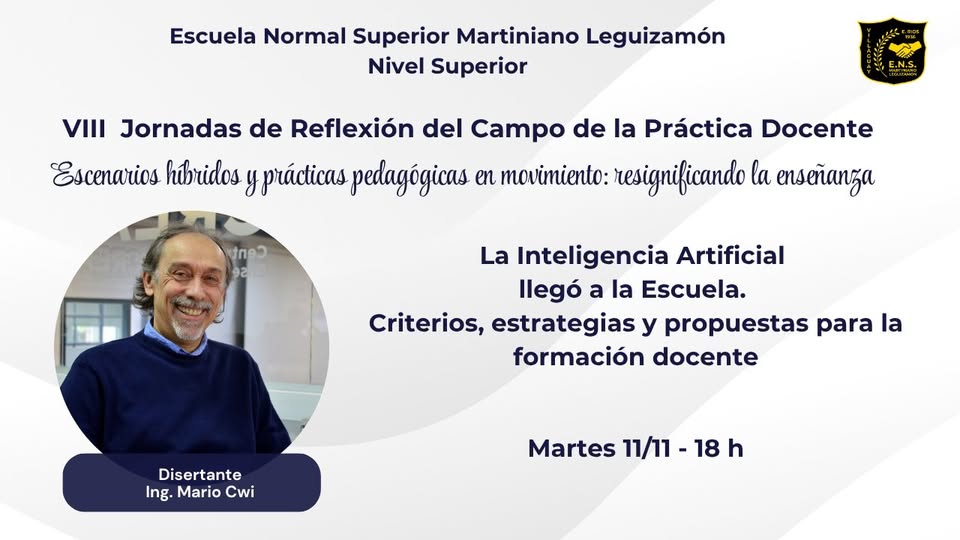 18:15 h – Panel Virtual La Inteligencia Artificial llegó a la Escuela. Criterios, estrategias y propuestas para la formación docente, a cargo del Mg. Mario Cwi.
