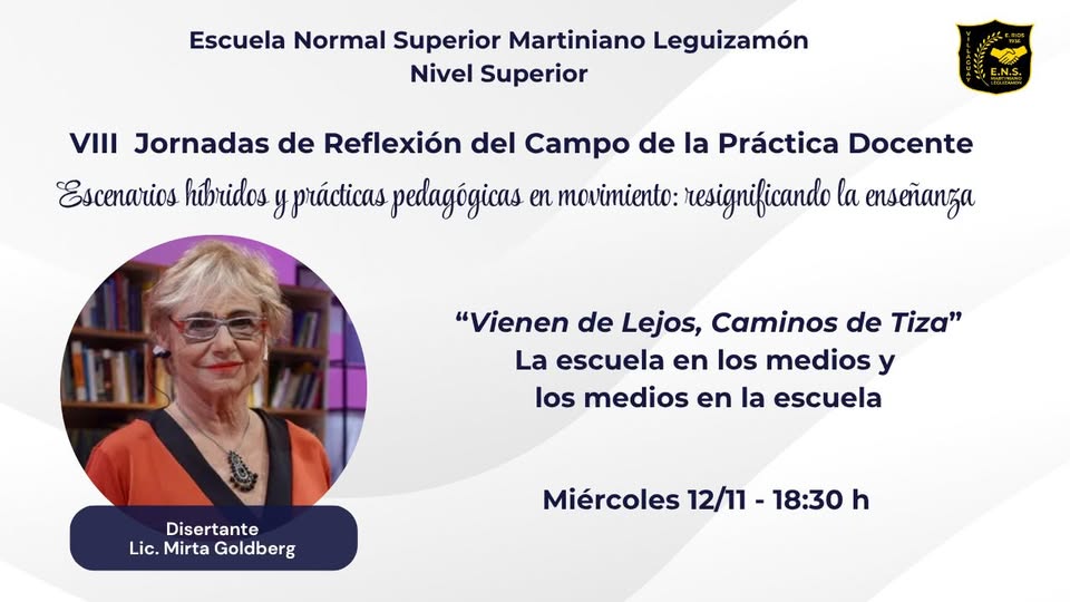 18:30 h – Panel virtual “Vienen de Lejos, Caminos de Tiza” La escuela en los medios y los medios en la escuela, a cargo de Lic. Mirta Goldberg.