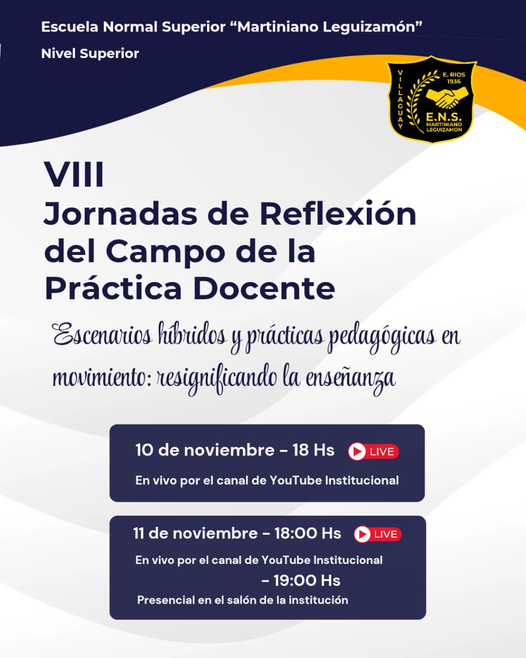 El Nivel Superior de la Escuela Normal Superior Martiniano Leguizamón invita a las VIII Jornadas de Reflexión del Campo de la Práctica Docente “Escenarios Híbridos y prácticas pedagógicas en movimiento: resignificando la enseñanza”. Las mismas tendrán lugar los días lunes 10 y martes 11 de noviembre a partir de las 18 horas.